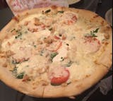 Our white pizza with ricotta cheese and mozzarella cheese, chicken, fresh tomatoes, and spinach.